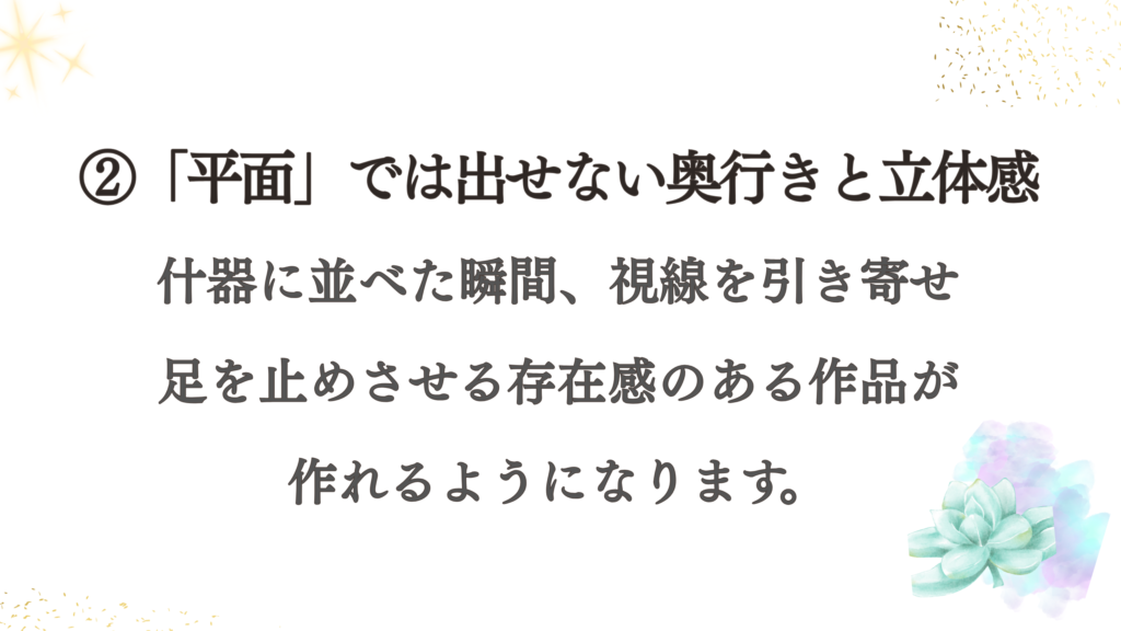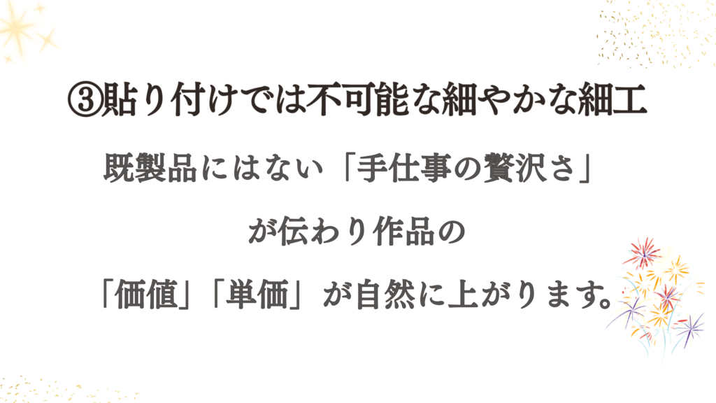 同じ材料を使っても、配置の仕方で、印象を大きく変えることができ、他の作家さんと差を付けやすい差別化にも向いた技法です。